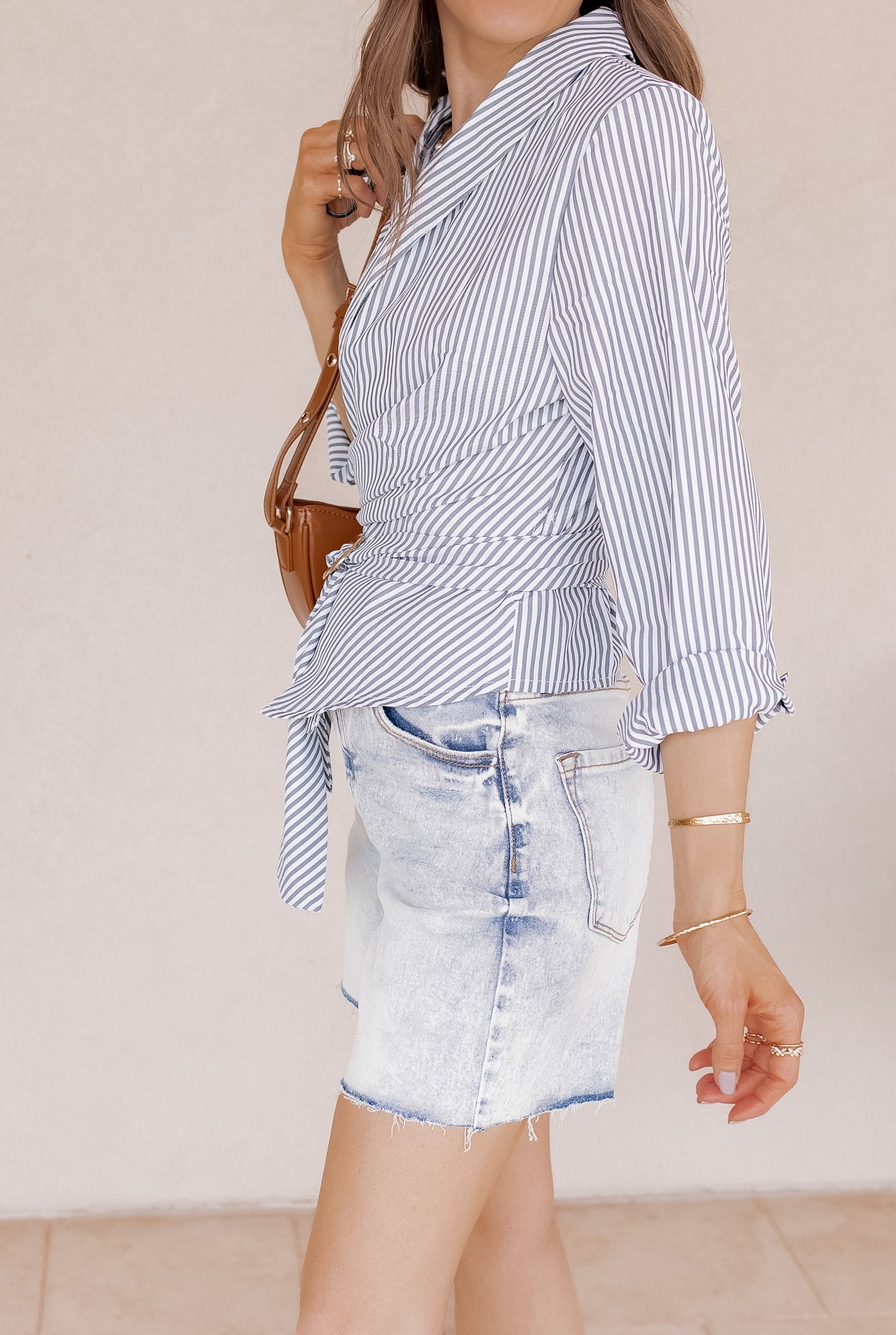 Pair this striped wrap blouse with white trousers or denim for a clean, polished look. Add heels or flats and a structured bag to take it from office to dinner effortlessly.