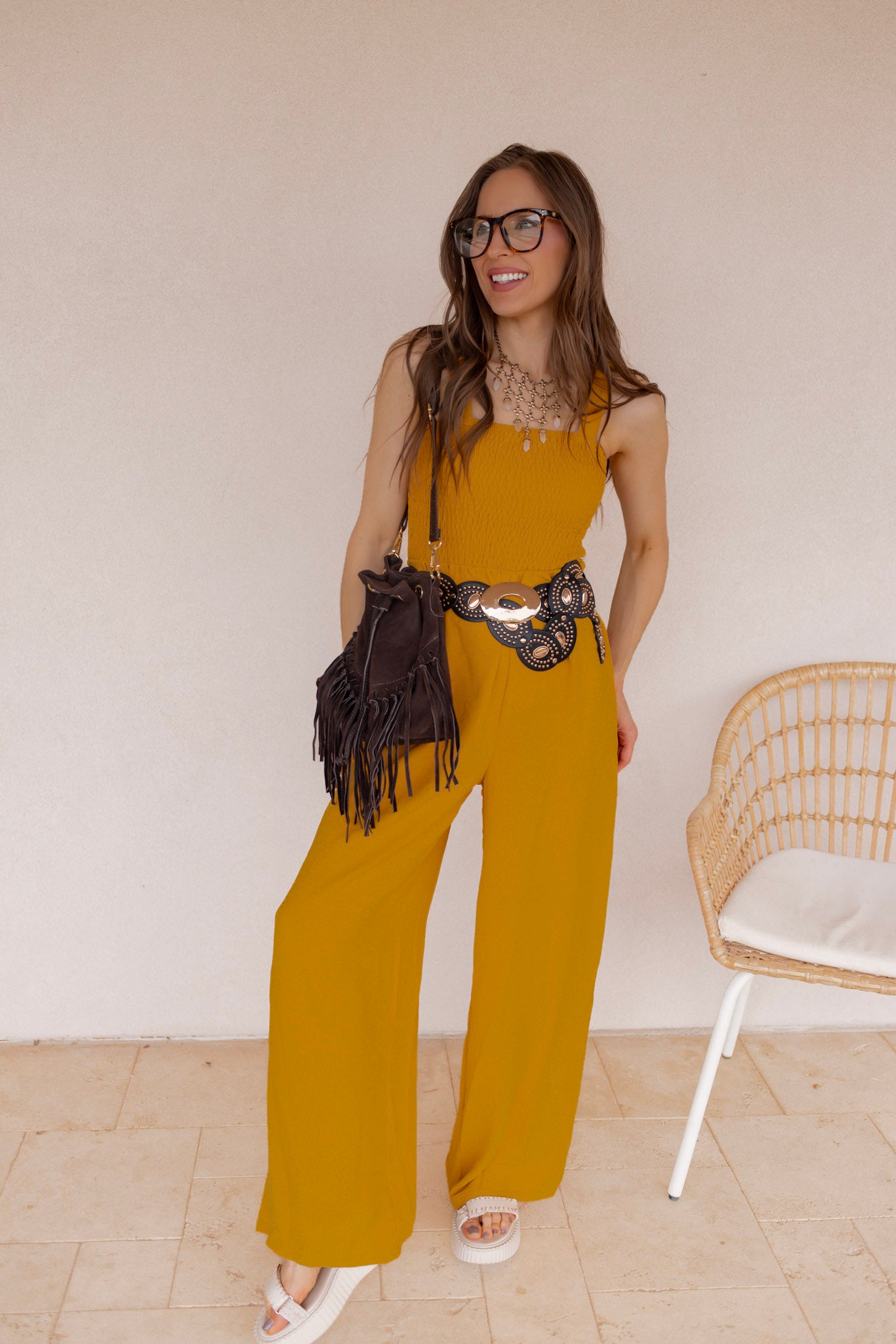 - Chic fringe detailing adds movement and boho-inspired style
