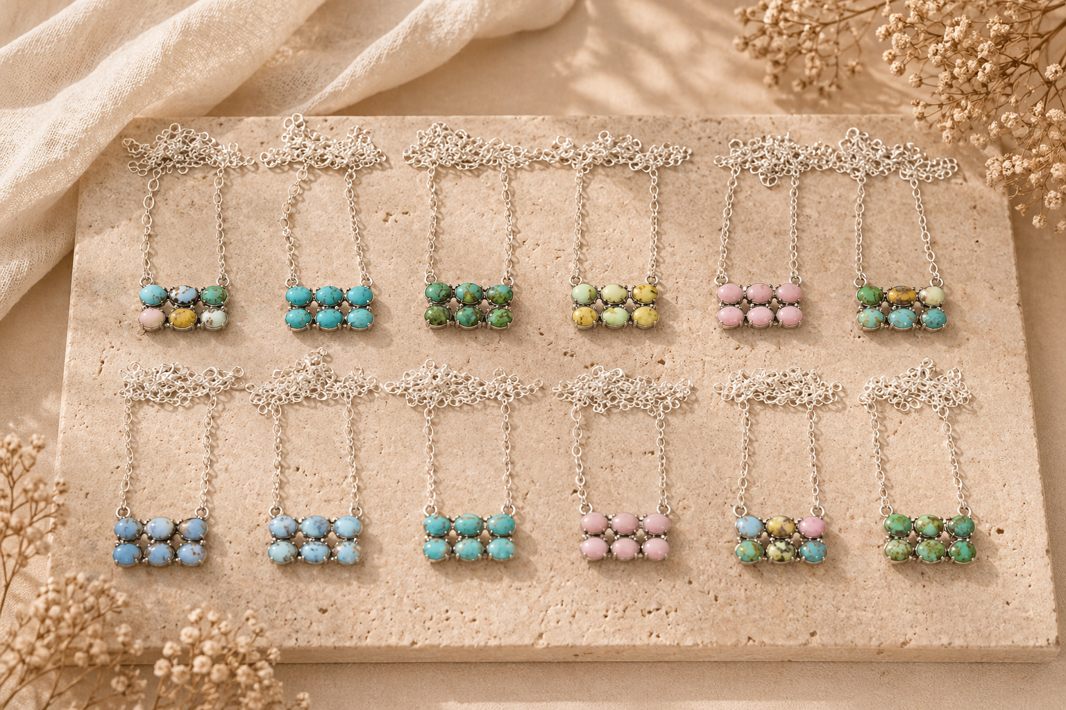Designs: Featuring a dainty gemstone cluster design, this necklace is available in multiple color options including turquoise, pink, blue, green, and multicolor combinations.