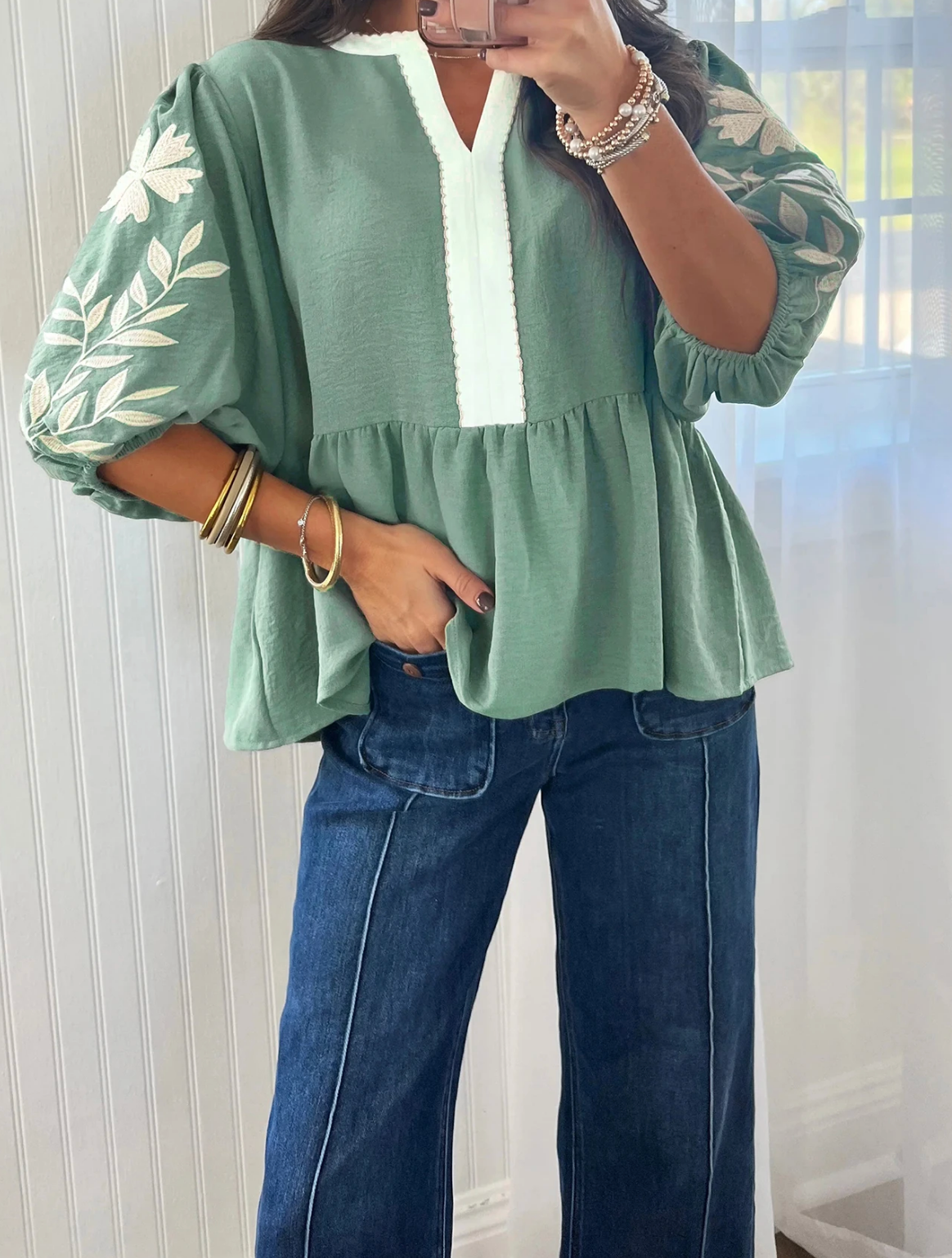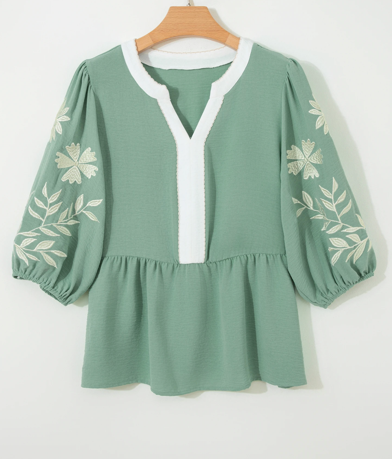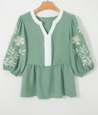 Color Block Patchwork V Neck Embroidered Puff Sleeve Babydoll Blouse