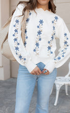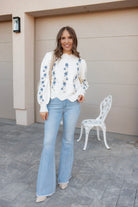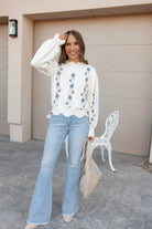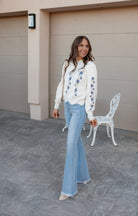 Soft, sweet, and stitched to perfection—this white cropped sweater features delicate floral embroidery and a scalloped hem that adds instant charm. The cozy knit and flattering fit make it ideal for layering over dresses or pairing with high-rise denim. With its romantic detailing and Western-boho undertones, this sweater is a standout piece for chilly days and golden hour moments.