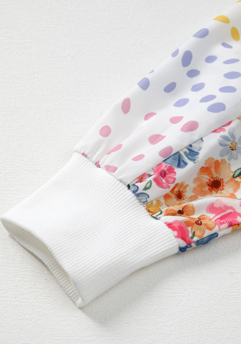 Add a touch of playful elegance to your wardrobe with the Floral Patchwork Sleeve Sweatshirt. This cozy top features a neutral cream base, highlighted by vibrant, multicolored floral and polka-dotted patchwork sleeves, making it a statement piece that effortlessly blends comfort and style. With its oversized fit and ribbed cuff detailing, this sweatshirt offers both a relaxed vibe and a chic edge. Pair it with your favorite denim or leggings for a laid-back yet stylish look.