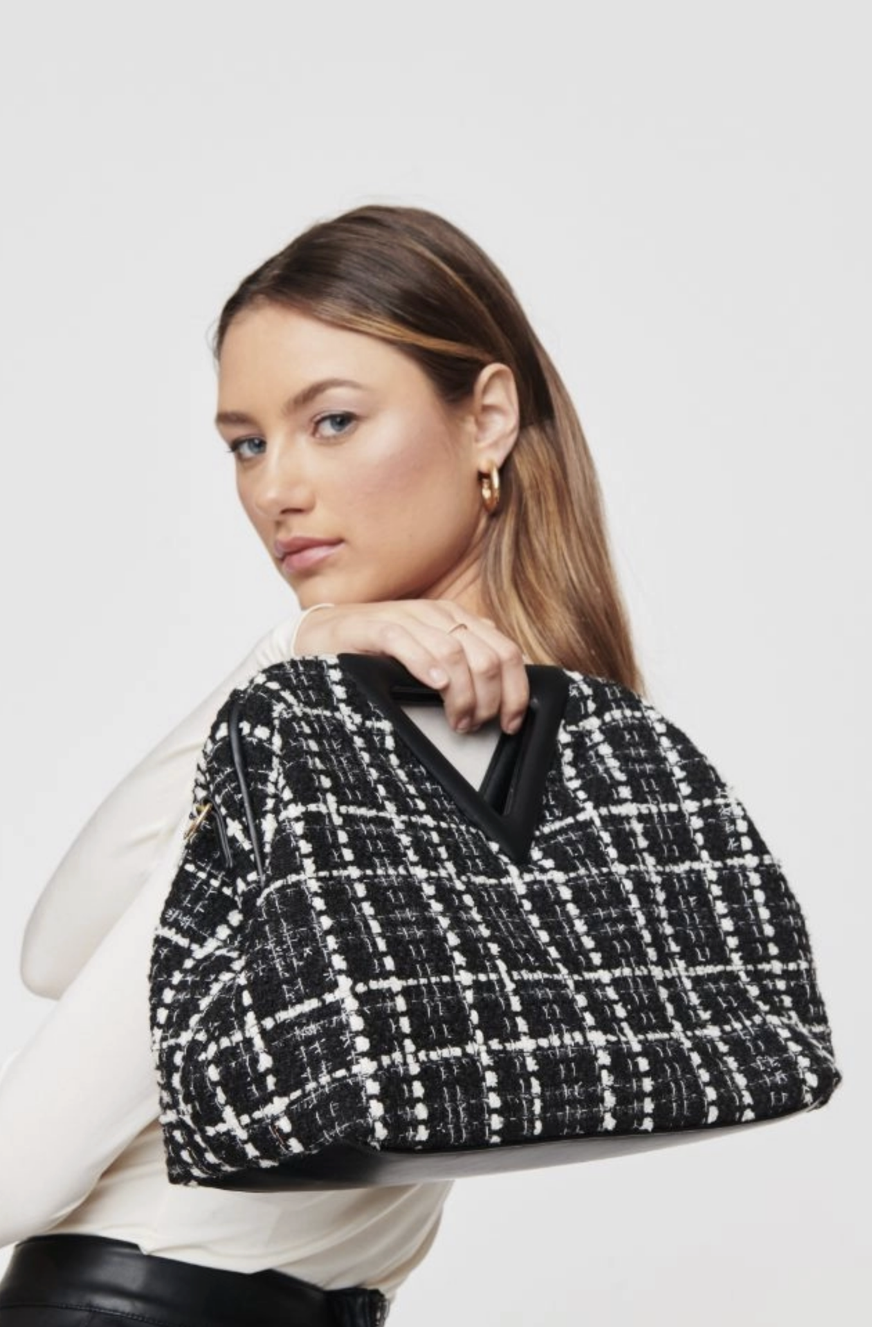 This Natasha Tweed crossbody bag is the perfect accessory for any outfit. The multi-color tweed fabric is eye-catching and unique, and the vegan leather trim adds a touch of luxury. The gold hardware completes the look. The bag features a magnet closure and is lined with fabric. It has one slip pocket inside, and comes with a detachable, adjustable shoulder strap. *Item Type: Crossbody *Material: Cotton *Bag Type: Crossbody Closure: Magnet *Exterior Details: Multi-color tweed fabric all-over, vegan leather trim, gold hardware *Inside Features: Fabric lined, 1 slip pocket *Extras: Detachable, adjustable shoulder strap