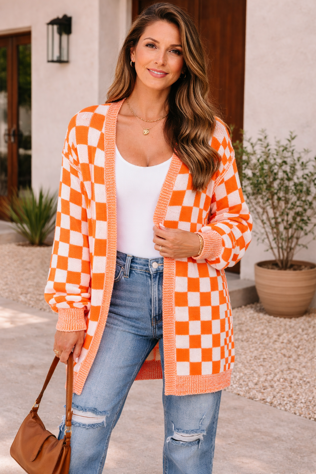 Orange Checkered Knit Cardigan – Bold Meets Cozy
