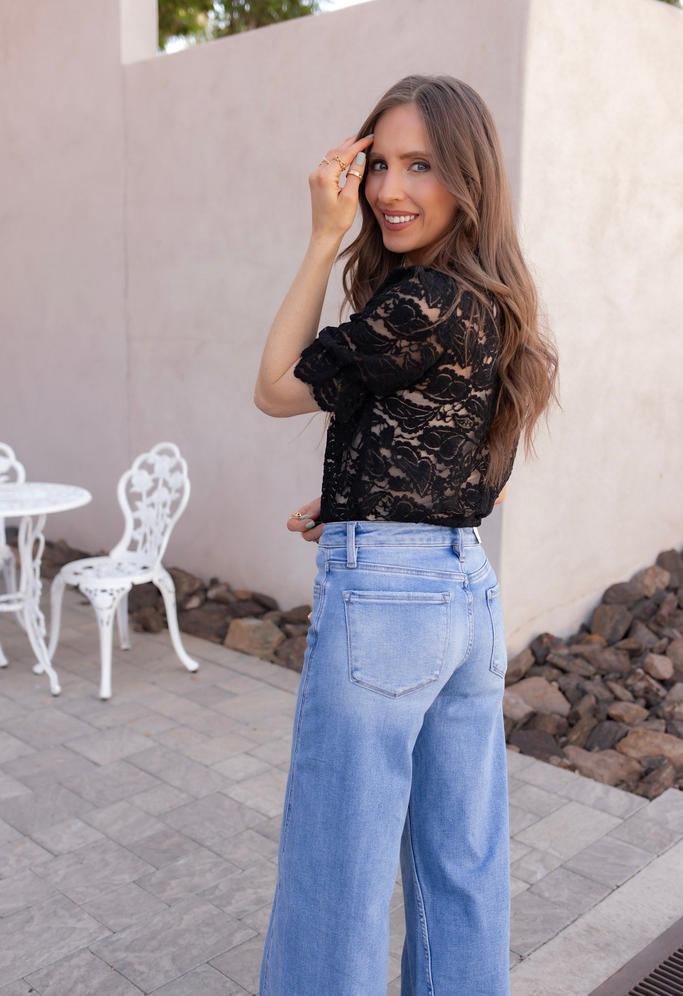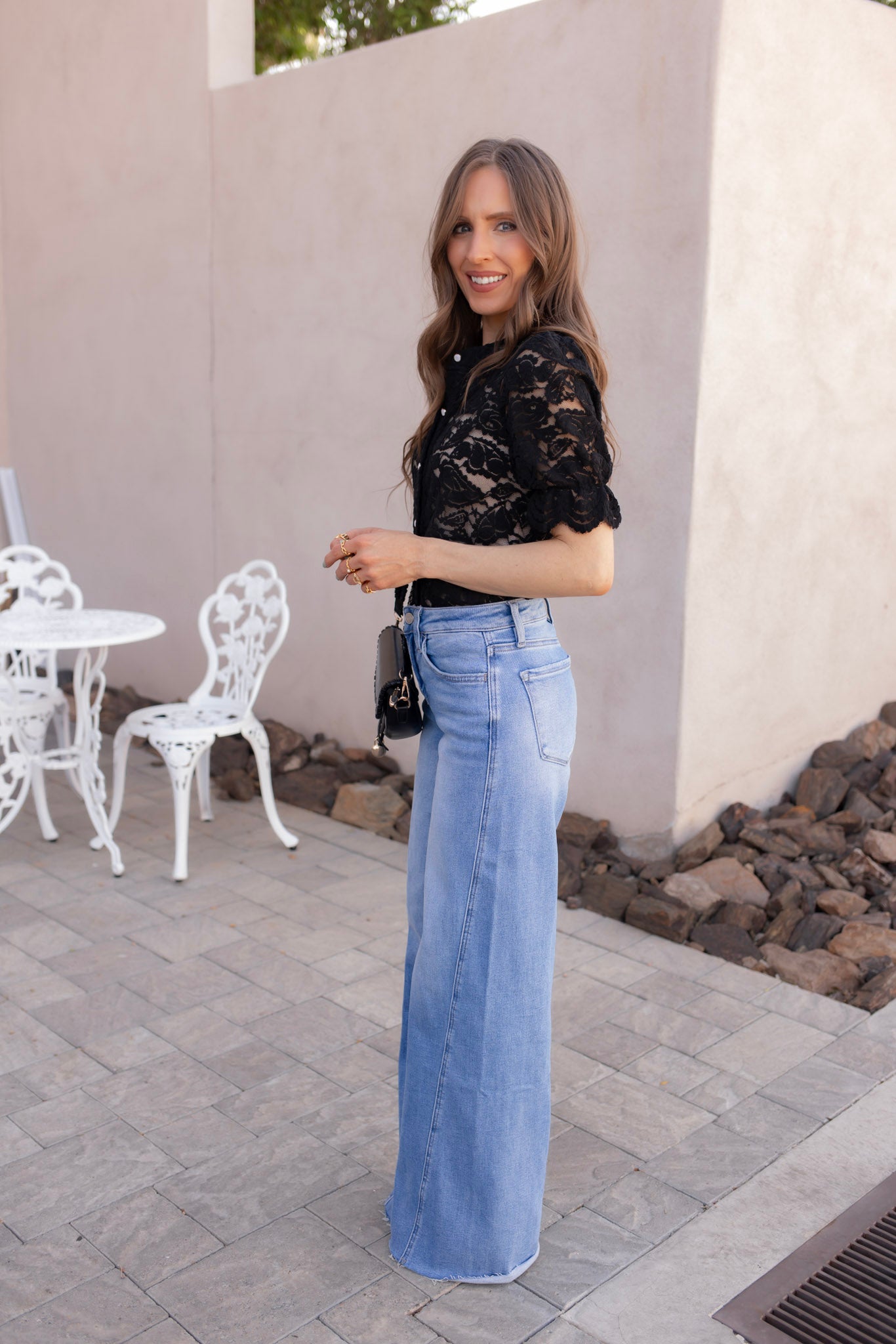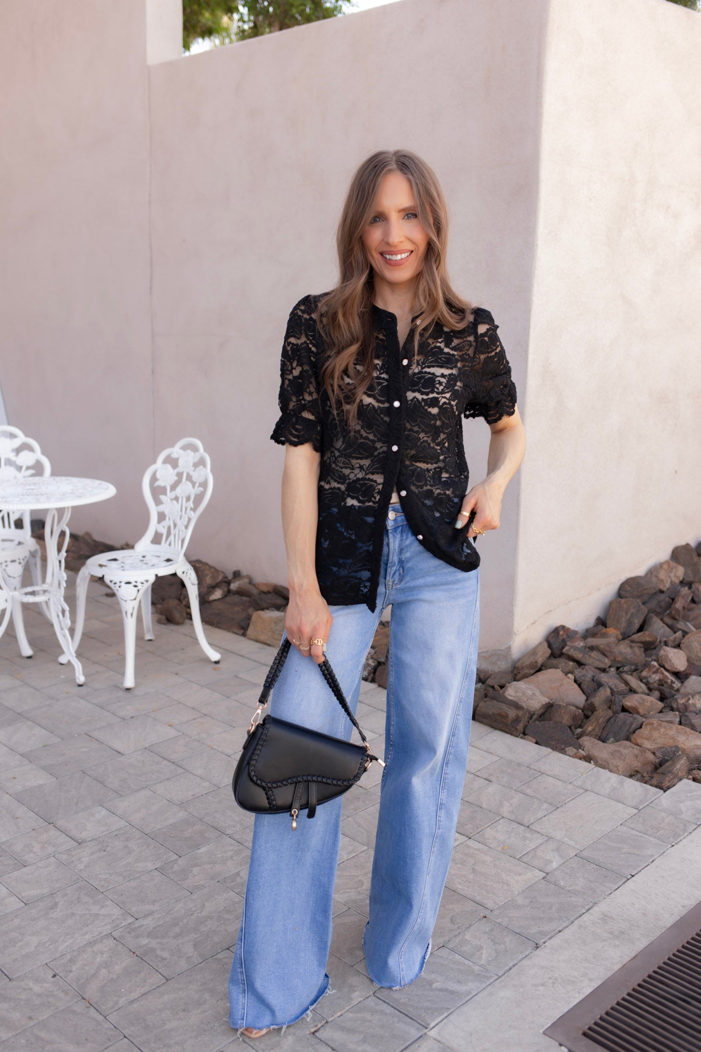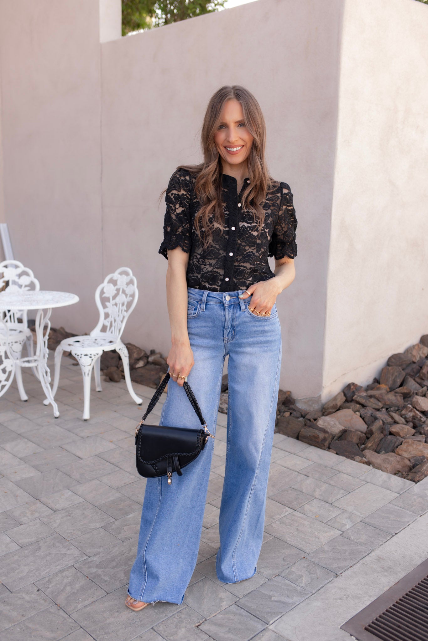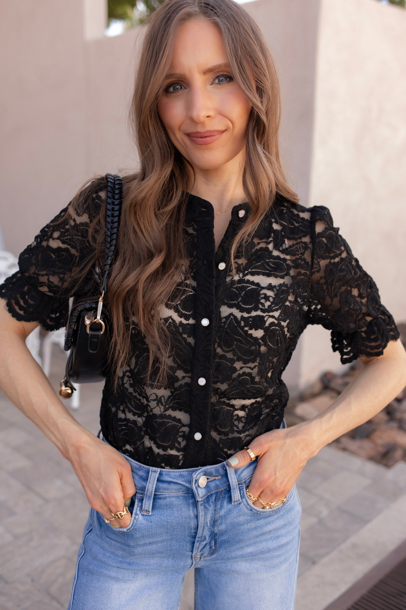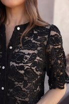 Style this lace button-up blouse with distressed denim or tailored trousers for a chic contrast. Layer it over a satin cami and add dainty gold jewelry for a romantic, picture-perfect finish that transitions from day to night.