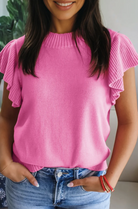 Solid Color Ribbed Trim Round Neck Ruffle Short Sleeve Sweater
