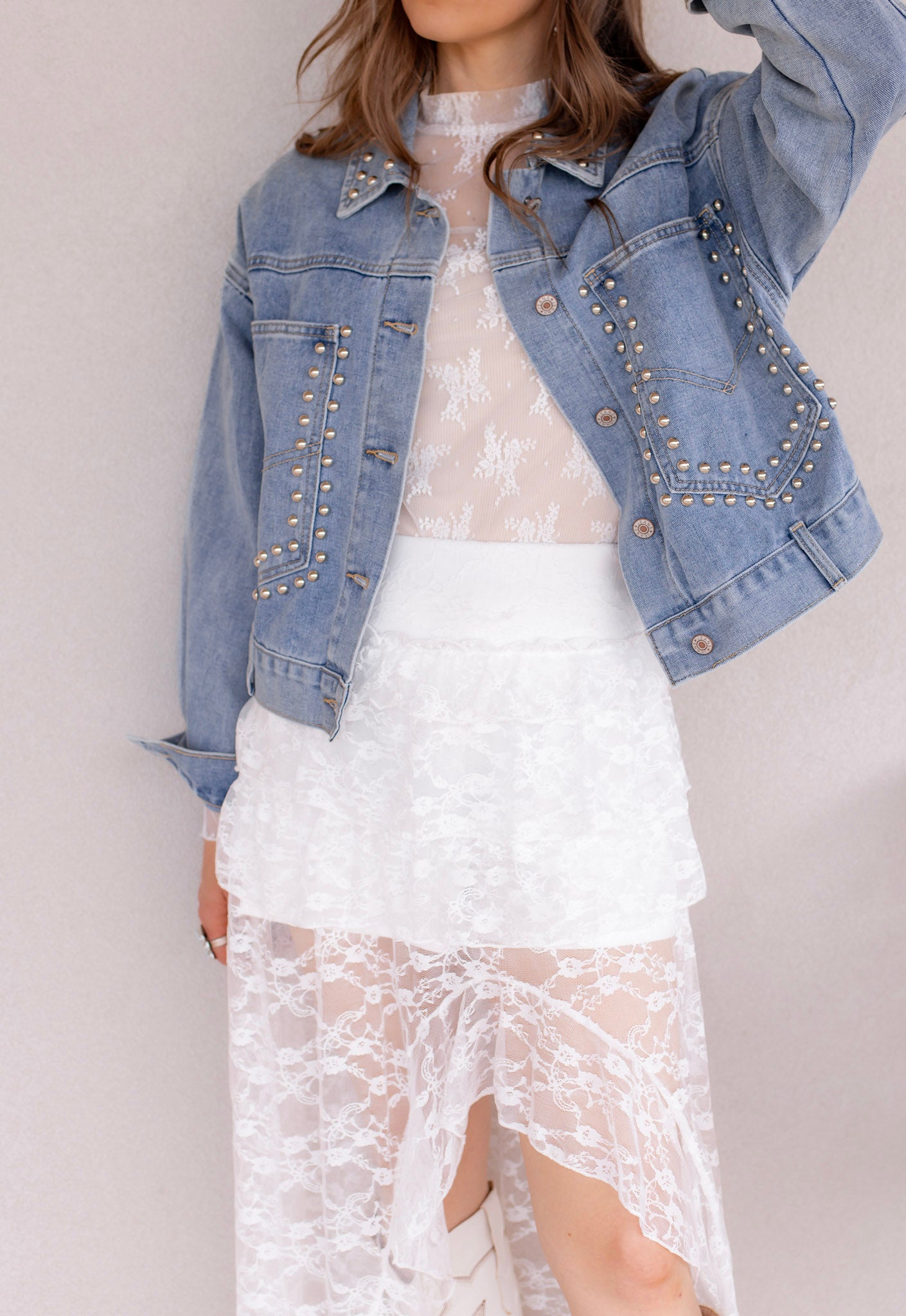 Pair this studded denim jacket with a lace dress for a feminine-meets-edgy look, or throw it on over a graphic tee and jeans for effortless everyday style. It’s the perfect statement layer for year-round outfits.