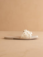 The Cathleen Ivory Pearl Raffia Slide Sandal blends effortless elegance with laid-back charm. Designed with a raffia-woven strap and finished with a delicate pearl-centered appliqué, this slide brings a romantic touch to a relaxed silhouette.